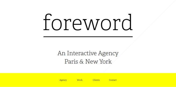 從 FOREWORD 的主頁上可以清晰地看到,他們將總部設在巴黎和紐約,頁面上沒有任何圖形圖像設計,只通過開放式的字體和顏色的設計來告訴用戶他們該關注什么。