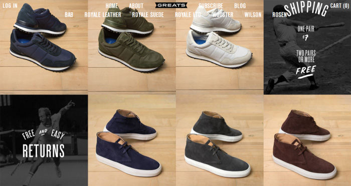 GREATS 是一家位于紐約的男鞋銷售企業,他們的產品銷售主要通過網站。GREATS 的網站選擇了網格布局方式,在主頁堆疊模塊,每個模塊顯示一雙鞋子的圖像。
